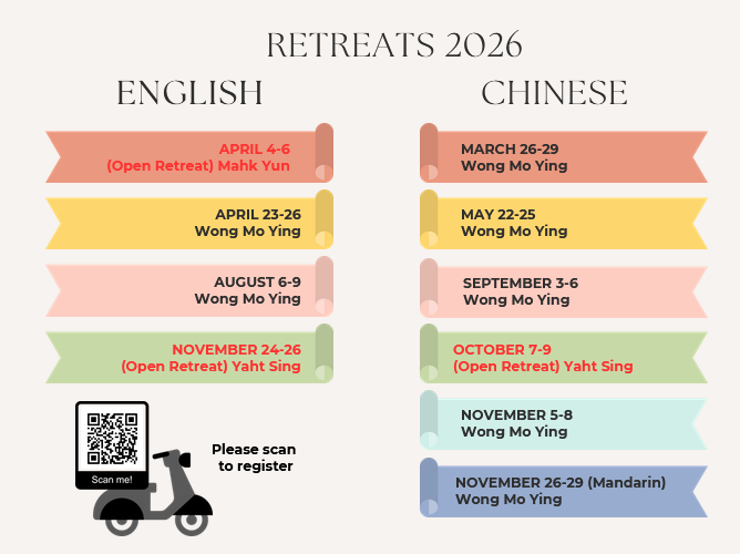 The open retreats will be in Yaht Sing or Mahk Yun. The retreat fee is $750. Full payment is required to make a reservation. 日間避靜將在日昇或麥園舉行,費用為港幣$750,需全數繳付作確認報名。